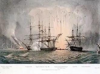 ![]() Gangut (Hanhoute) and Azoff, with explosion of a Turkish frigate, at the Battle of Navarino, 20 Oct 1827