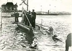 It was added to the navy list on 27 September 1902 as No. 150 and that same year the first crew members began to be gathered. The submarine was launched in May 1903 and the sea trials began the following month on 21 June in the Gulf of Finland.[4] They were a success, although they also showed that it had a diving time of 12 minutes. The time to reach periscope depth was later reduced to five minutes.[7] The submarine was inspected by Emperor Nicholas II and other officials on the Neva river in late August 1903.[4] The trials were completed on 14 October, which is considered to be the founding date of the Russian submarine fleet.[3] No. 150 became the first combat submarine in the Russian Navy,[5] though it continued to be classified as a "torpedo boat" until March 1906.[3] After finishing the trials No. 150 returned to the Baltic Works where it underwent some modifications, including the installation of a latrine for the crew.[4]