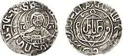 Ghias ad-Din's position at the Georgian court was weak and the spousal relationship was strained due to Rusudan's unfaithfulness. Reporting her scandalous love affairs and adulterous way of life, ibn al-Athir recounts that on one occasion Rusudan was surprised by her husband in bed in the arms of a slave ("mamluke"). As Ghias ad-din refused to condone this fact, ibn al-Athir continues, Rusudan had him moved to "another town" under strict supervision.[5] His name does not appear on coins issued in the name of Rusudan.[6]
