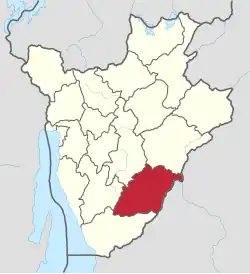 Rutana Province was in the southeast of Burundi and borders Tanzania to the east. Makamba Province was to the south, Bururi Province and Gitega Province to the west and Ruyigi Province to the north. The west of the province is in the Buragane natural region, the northwest in the Buyogoma natural region and the east in the Kumoso natural region.[2]
