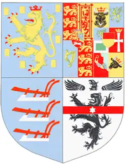 The shield of the Rutgers coat of arms appears on the university gonfalon, and is at the head of all processions. The first quarter bears the arms of Nassau, the House of Orange, and recognizes the Dutch founders. The arms in the upper sinister quarter are those of George III combined with Queen Charlotte's. It was George III who granted the Charter of 1766 to Queen's College, named in honor of Charlotte of Mecklenburg, King George's consort. The arms shown on the sinister half are Queen Charlotte's. The third quarter from the Seal of the State of New Jersey. The fourth quarter is the coat of arms of Colonel Henry Rutgers.