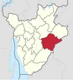 Ruyigi Province was in the center of eastern Burundi, bordering Tanzania to the east. It was north of Rutana Province, east of Gitega Province, southeast of Karuzi Province and south of Cankuzo Province. The western part of Ruyigi Province is in the Buyogoma natural region and the eastern part in the Kumoso natural region.[2]