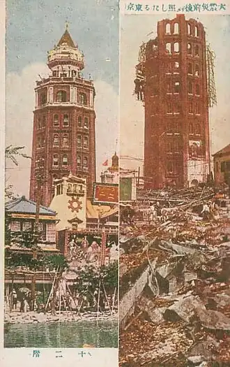 The Ryōunkaku (凌雲閣, Ryōunkaku; lit. Cloud-Surpassing Pavilion or Cloud-Surpassing Tower) was Japan's first Western-style skyscraper. It stood in the Asakusa district of City of Tokyo (now Taitō, Tokyo) from 1890 until its demolition in 1923 following the Great Kantō earthquake of 1923. The Asakusa Jūnikai (浅草十二階; lit. Asakusa Twelve-stories), as it was affectionately called by Tokyoites, was Tokyo's most popular attraction, and a showcase for new technologies. It housed Japan's first electric elevator.