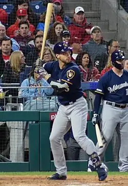 He finished the season with an NL-leading 203 hits, becoming the first Brewer to lead his league in hits since Molitor topped the AL in 1991.[108] Braun became the fourth Brewer in team history to collect 200 or more hits in a season, and the first in 18 years.[109] His .320 batting average at the end of the season was the highest by a Brewer since Jeff Cirillo hit .326 in 1999.[110]