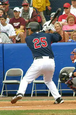 In 2005, Garko spent spring training with the Indians, but he was returned to the minor leagues before the regular season.[23] He spent most of the season with Triple-A Buffalo, batting .303 with 19 home runs, and 77 RBI in 127 games with the Bisons.[17] Halfway through the 2005 season, Garko was selected to the International League all-star team.[24] He was also selected to the All-Star Futures Game in Detroit.[25] On September 18, 2005, Garko made his major league debut against the Kansas City Royals, pinch-hitting for Travis Hafner in the eighth inning and striking out against Chris Demaria.[26] That was his only major league appearance of the year.[27] For the second straight season, Garko played in the Arizona Fall League at the end of the season,[28] this time with the Mesa Solar Sox. He batted .314 with 27 hits, five home runs, and 27 RBI in 23 games.[10]