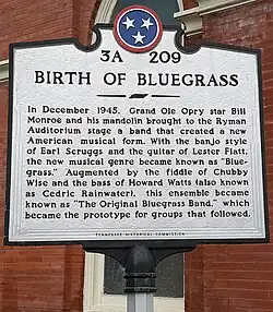 Tennessee Historical Commission marker outside Ryman Auditorium, signifying the site as the birthplace of Bluegrass music