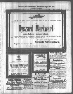 To improve his health, Ryszard Markwart went to the health resort of Międzyzdroje[7] on the Baltic Sea, where he died on 16 August 1906,[8] while swimming. He was buried at the Nowofarny Cemetery, in a ceremony attended by a multitude of Polish inhabitants of Bydgoszcz and its surroundings.[9]