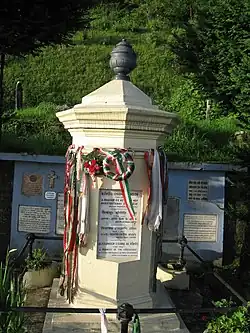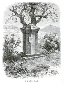 The grave of Csoma at Darjeeling was marked by a memorial by the Asiatic Society of Bengal. It is included in the list of monuments of historical maintained by the Archaeological Survey of India (Calcutta circle). A tablet was placed by the Hungarian government with the words of Count István Széchenyi : "A poor lonely Hungarian, without applause or money but inspired with enthusiasm sought the Hungarian native country but in the end broke down under the burden".[2] A project has been started to restore the old royal palace (Kharkongma) of Zangla where Csoma de Kőrös lived and compiled his Tibetan–English dictionary.[12]