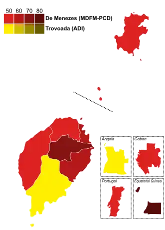 Presidential elections were held in São Tomé and Príncipe on 30 July 2006. Incumbent Fradique de Menezes, first elected in 2001, won with more than 60% of the vote, while his main challenger, Patrice Trovoada, son of a former president received just over 38%. The third candidate, Nilo Guimarães, received less than 1% of the vote.