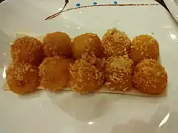 Sì (pronounced [si˥˧], Min Dong Chinese: 𥻵, transcribed as sì in Foochow Romanized) is a traditional spherical dessert made from glutinous rice, eaten in celebration of the Winter Solstice festival in Fuzhou, Fujian Province, China. It is usually produced without filling, in contrast to the tangyuan. The sì is made by grinding glutinous rice into a powder, pressing the powder until almost dry, and then rolling the dry powder into a spherical shape, and finally adding fried (even burnt) soybean powder mixed with brown sugar onto the glutinous rice sphere.