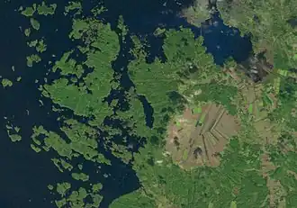 Söderfjärden is a polder in Ostrobothnia, western Finland, 10 kilometres south of the town of Vaasa. The plain is in an impact crater dating back to more than 640 million years ago (Proterozoic, near the end of the Cryogenian). The crater's diameter is 6.6 kilometres (4.1 mi) and its maximum depth is 300 metres (980 ft). It is filled with Cambrian sandstones leaving only the outer rim visible. There is also a central uplift, which is buried. After rising from the sea due to post-glacial rebound, Söderfjärden was a wetland but was later drained with help of a pump station. It is currently cultivated and is clearly visible from air as a large hexagonal field. This makes Söderfjärden unique among the other impact structures in Finland which are at least partially below sea level. The area of the basin is divided half and half between Vaasa and Korsholm, with a small corner belonging to Malax.[1][2]