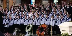 Sølvguttene ("The Silver Boys") is a boys' choir founded by Torstein Grythe in June, 1940. He held the position as conductor until 2004, when Fredrik Otterstad took over.[1] In 2019, Frikk Heide-Steen was hired as full-time conductor alongside Otterstad. The choir had its first rehearsals in Grythes apartment in Oslo, but were soon offered to rehearse in Norwegian Broadcasting’s (NRK) facilities. The thought was that the choir would be permanently linked to NRK, and the first radio performance was held in December 1940. Conditions during the German occupation soon made it impossible to continue the cooperation with NRK, and the choir was for the remainder of the war years managed by the founder/conductor. Sølvguttene got its name primarily because of the shiny, silvery uniforms that were acquired in the beginning (for lack of other, more subtle materials). Later the name has been attributed to the special sound and clarity of boys voices, voices of silver.