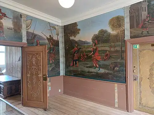 The museum's vestibule features a large runestone from the ninth century. The ticket office is decorated with the interior furnishings of an old grocery shop. A room on the first floor features a set of canvas tapestries with eight scenes from François de Salignac de la Mothe‑Fénelon's 1699 novel Les Aventures de Télémaque. They were most likely installed during Claudius' ownership in 1750–1769. Another mural is based on one of Jacob de Gheyn's illustrations for the 1717 117 engravings for the military manual The Exercise of Armes.[6]