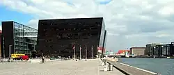 Søren Kierkegaards Plads is a harbourside public square on Slotsholmen in central Copenhagen, Denmark, named after Danish philosopher Søren Kierkegaard. It occupies a strip of waterfront between the Black Diamond, whose main entrance faces the square, and the Frederiksholm Canal. Away from the water, the square is faced by Christian IV's Brewhouse as well as his old arsenal, now housing the Royal Military Museum. The thoroughfare Christians Brygge runs through the square which is connected to the water by "ghats" which also serve as seating for spectators for the occasional performances on a floating stage in the harbour basin.