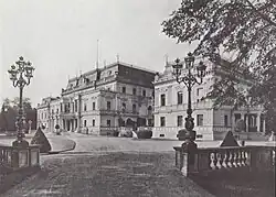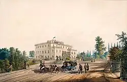 The old castle was a massive square building with a single roof and was surrounded by a moat.[2] After a lightning strike, the old castle burned down in 1827.[2] A new three-storey mansion was built on the same site in 1830,[3] with side wings added between 1867 and 1868.[3] The mansion had around 45 rooms including a large ballroom.[6]