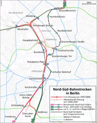 Almost parallel to the S21 run two other railway tunnels in a north-south direction: The first north-south tunnel of Berlin S-Bahn is the tunnel section below the city center and includes the section Bornholmer road–Gesundbrunnen–Friedrichstrasse–Anhalter station–Priesterweg/Schöneberg, A link between both tunnels is planned at the stations Potsdamer Platz and Yorckstraße. The north-south long-distance railway line for long-distance and regional trains from Nordring via Hauptbahnhof to Südkreuz runs through the Nord-Süd-Fernbahn tunnel, which was commissioned in 2006.