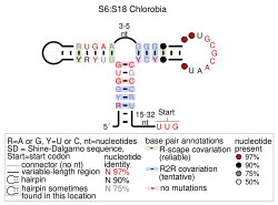 S6:S18 ribosomal protein leader is a ribosomal protein leader involved in the ribosome biogenesis. It is used as an autoregulatory mechanism to control the concentration of the ribosomal proteins S6:S18 complex. An experimentally confirmed example of such a leader occurs in a wide variety of bacteria,[2] though not all phyla. A S6:S18 ribosomal leader was predicted in Chlorobia,[1] and its predicted structure differs from that of the validated S6:S18 ribosomal leader. This structure is located in the 5′ untranslated regions of mRNAs encoding ribosomal proteins rpsF (S6), the Single-strand DNA-binding protein A (ssbA), S18 (rpsR) and L7/L12 (rpll).[1]