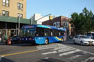 This route uses rigid 40-foot Nova LFS diesel buses; it originally ran Orion VII NG Hybrid buses, now using the EPA10s from Castleton Depot if needed and available. The S79 is the only SBS line that does not utilize off-board fare collection, and so it prevents all-door boarding; when SBS was implemented in 2012, the Metropolitan Transportation Authority (MTA) had determined that off-board fare collection was unnecessary since the route's boarding times were short enough.[5] Additionally, it is one of two SBS routes that does not use 60-foot articulated buses, along with the B82 SBS, as well as the only SBS line to not have blue destination signs until July 2017. Riders must pay the fare on board, as they do on local, limited-stop, and express buses.
