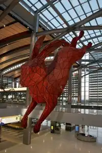 The Terminal B lobby prominently features the 2011 artwork "Leap" by Lawrence Argent, consisting of a 56-foot (17 m) long red aluminum rabbit leaping into a large granite suitcase,[57] resulting in the unofficial nickname "the Hare-port."[58] In total, 14 artists were commissioned at a sum cost of $6 million to create artworks for the new Terminal B,[59] including the mixed media wood-and-crystal sculpture "Acorn Steam" by Donald Lipski (named as an anagram of "Sacramento"), the interactive "Your Words are Music to My Ears" by the collaboration Living Lenses, consisting of artists Po Shu Wang and Louise Bertelsen,[58] a large wooden sculpture portrait entitled "The Baggage Handlers" by Christian Moeller, and a painted steel-and-glass house entitled "The House Will Not Pass for Any Color but Its Own" by Mildred Howard.[60][61][62]