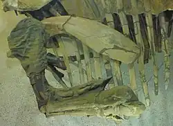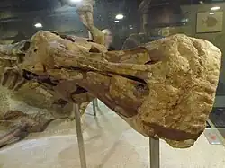 The Edmontosaurus mummy SMF R 4036 is an exceptionally well-preserved dinosaur fossil in the collection of the Naturmuseum Senckenberg (SM) in Frankfurt am Main, Germany. Found in 1910 in Wyoming, United States, it is ascribed to the species Edmontosaurus annectens (originally Trachodon), a member of the Hadrosauridae ("duckbilled dinosaur"). The fossil comprises a nearly complete skeleton that was found wrapped in impressions of its skin, a rare case of exceptional preservation for which the term "dinosaur mummy" has been used.[1] Notably, the horny beak is preserved with this specimen. Plant remains found within the thorax cavity had been interpreted as stomach contents, although later research questioned this identification. The mummy's hands are wrapped in skin impression, which was interpreted as evidence for interdigital webbing and an aquatic lifestyle in hadrosaurids; this hypothesis, although universally accepted once, is now widely refused. SMF R 4036 is one of the four best preserved hadrosaurid mummies, and was the second to be discovered.[2] The find was made by fossil hunter Charles Hazelius Sternberg and his sons, who sold their numerous finds to various museums in North America and Europe. Only two years earlier the Sternbergs had discovered the Edmontosaurus mummy AMNH 5060 in the same region, which is now on display at the American Museum of Natural History (AMNH) in New York City.