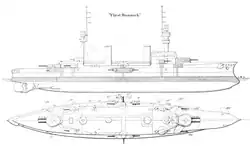SMS Fürst Bismarck (Prince Bismarck)[a] was Germany's first armored cruiser, built for the Kaiserliche Marine (Imperial Navy) in the late 1890s. Built in response to widespread foreign adoption of the type, Fürst Bismarck was intended to serve abroad in the German colonial empire and as a scout for the main fleet in home waters. The ship traced its origin to a failed design competition in the early 1890s that was heavily influenced by the new emperor, Kaiser Wilhelm II. Though the competition failed to produce a workable design, further efforts eventually resulted in the development of Fürst Bismarck, which was in many respects a cruiser version of the contemporary Kaiser Friedrich III class of battleships. Fürst Bismarck carried the same main battery of four 24 cm (9.4 in) guns as the battleships, but was faster due to a longer, lighter hull and more powerful engines.