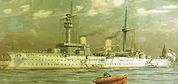 In January 1906, Fürst Bismarck began a tour of Indonesia,[48] after which she went to Hong Kong via North Borneo in late February.[49] She remained there for almost a month, departing on 23 March to meet the rest of the squadron, which by then could be withdrawn from Shanghai. Fürst Bismarck and Hansa, the only major warships assigned to the squadron by that time, visited Japanese ports in May. On 28 May, Fürst Bismarck went to Taku, where Breusing and his staff traveled overland to Beijing, the first German naval officers to visit the Guangxu Emperor and Empress Dowager Cixi after the Boxer Rebellion. Hansa began the voyage back to Germany on 4 July, and on 9 August, the light cruiser Niobe arrived to join the squadron. On 19 November, the light cruiser Leipzig arrived to further strengthen the squadron. Fürst Bismarck and Tiger went on another tour of Indonesia and Japan in early 1907. On 13 May, KAdm Carl von Coerper arrived to replace Breusing; he began his tenure as squadron commander by boarding Tiger for a cruise into the Yangtze to familiarize himself with German economic interests in the area. After returning to Fürst Bismarck, he visited Japan in company with Niobe. During the squadron maneuvers that year, Fürst Bismarck won the Schießpreis for a fourth time.[48]