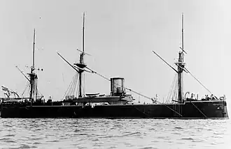 The 1882 training year followed a similar pattern to previous years; the ship was recommissioned on 2 May, again under Knorr's command. The summer cruise included the same four ironclads from the previous year, and was again commanded by Wickede, who had by then been promoted to Konteradmiral.[11][12] Friedrich der Grosse was kept in reserve during the annual summer maneuvers starting in 1883, as new ships, including the rest of the Sachsen-class ironclads entered service.[13] From 1883 to 1885, the ship underwent a modernization that included new boilers and a reconstructed poop deck. Two 37 mm (1.5 in) Hotchkiss guns and five torpedo tubes were added in above-water mounts.[14] During this period, the ship was commanded by KzS Bartholomäus von Werner to undergo periodic sea trials as work on the ship was carried out. The ship was reactivated on 6 April 1888 to participate in the year's training activities. After conducting trials in the Jade Bay, before join the rest of the squadron in Kiel on 22 May. The ships embarked on a tour of the Baltic for the newly enthroned Kaiser Wilhelm II in July, by which time KzS Ernst von Reiche took command of the ship. The voyage included visits to St. Petersburg, Stockholm, and Copenhagen. They met Alexander III and the Swedish King Oscar II, who inspected the German warships and conferred decorations on the senior officers. Friedrich der Grosse participated in that year's fleet maneuvers, and on 29 September the ship departed the Baltic for Wilhelmshaven. She was decommissioned there temporarily before being reactivated on 1 October as the active ship of the newly created Reserve Division of the North Sea. In that role, she served as the guard ship in Wilhelmshaven, in company with the aviso SMS Wacht. KzS Oscar Klausa became the ship's captain at that time.[12][15]