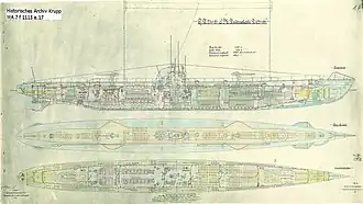 Type U 93 submarines were preceded by the shorter Type U 87 submarines. U-106 had a displacement of 798 tonnes (785 long tons) when at the surface and 1,000 tonnes (980 long tons) while submerged.[1] She had a total length of 71.55 m (234 ft 9 in), a pressure hull length of 56.05 m (183 ft 11 in), a beam of 6.30 m (20 ft 8 in), a height of 8.25 m (27 ft 1 in), and a draught of 3.90 m (12 ft 10 in). The submarine was powered by two 2,400 metric horsepower (1,800 kW; 2,400 shp) engines for use while surfaced, and two 1,200 metric horsepower (880 kW; 1,200 shp) engines for use while submerged. The boat had two propeller shafts and two 1.70 m (5 ft 7 in) propellers. The boat was capable of operating at depths of up to 50 metres (160 ft).[1]