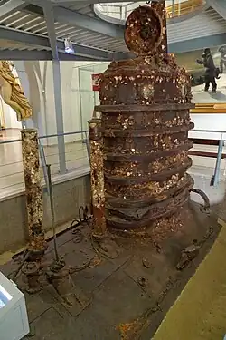 In mid 1962, the wreck of U-20 was discovered in the northern Adriatic. Italian salvage crews raised the boat's rear portion on 22 July and her front section on 21 November.[4] The conning tower and a small midships section of U-20 were donated to the Heeresgeschichtliches Museum in Vienna, where they are on display, while the rest of the boat was scrapped.[7] The remains of the crewmen were buried on the grounds of the Theresian Military Academy at Wiener Neustadt.[10]