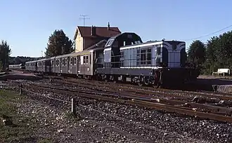 The SNCF Class BB 66400 is a class of centre cab mixed traffic diesel locomotives. The class is a development of the BB 66000 with 3 phase electric transmission. The 106 locomotives were built for SNCF by a consortium of CAFL, CEM, Alsthom, Fives-Lille and SACM between 1968 and 1971. They are 14.972 m (49.12 ft) long and weigh 64 t (63 long tons; 71 short tons). The prime mover is a MGO V16BSHR diesel engine developing 1,030 kW (1,380 hp). The maximum speed is 120 km/h (75 mph).[1]