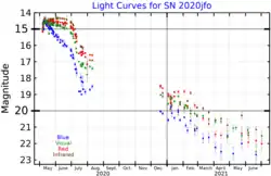 SN 2020jfo was a type II supernova in the Messier 61 galaxy, first observed on 6 May 2020 with an apparent magnitude of 16.01. It was one of the first supernovae for which independent, multi-instrument data was collected before, during, and after the explosion.[1] Large astronomical surveys like Transiting Exoplanet Survey Satellite (TESS) and Pan-STARRS have played a role in data collection before and after these events.[2][3][4]