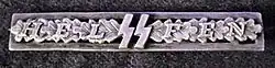 SS-Helferinnen stationed at the Reichsschule-SS, the main training school at Oberrenheim, wore a black machine-woven rayon cuffband with silver-grey edges and the inscription "Reichsschule-SS" on the lower left sleeve, while other auxiliaries wore a cuffband inscribed "SS-Helferin". In July 1943, a special award known as the Silberspange für SS-Helferinnen (Silver Clasp for SS-Helferinnen) was introduced; this clasp featured a silver rectangular frame with SS runes and sprays of oak leaves, inscribed with "HEL" and "FEN" to form the word "Helfen" (to help), though there are no surviving records of actual awards or photographs of the clasp being worn. The SS-Kriegshelferinnen (war helpers) wore a similar uniform but were not permitted to wear the cuffband or the SS runes patch on the breast pocket.[22]