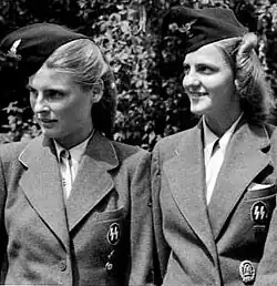Alternatively, women could also serve as civilian employees, known as the SS-Gefolge (lit. 'female SS overseer'), without being formal members of the SS; they served in an auxiliary capacity and did not belong to the SS “clan” or family.[5] These included not only concentration camp guards (SS-Aufseherinnen), but also doctors, nurses, telephone operators, teletypists, and radio operators within the Waffen-SS.[6]