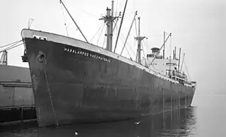 The ship participated in the Philippines campaign in 1944, being credited with destroying a Japanese aircraft on 24 November 1944.[6] While under heavy fire from Japanese aircraft on 27 December 1944, the ship landed 10,000 tons of ammunition at Mindoro, while firing eleven tons of ammunition at Japanese aircraft, shooting down several aircraft in the process.[6][7] Captain John J. Brady, the officers, and the crew of Francisco Morazan were commended by Brigadier General William C. Dunckel for "maintaining full efficiency and a well disciplined ship's and gun crew despite a perilous cargo".[4][7] Francisco Morazan was the only ship of the caravan of three Liberty ships, the others being the SS John Burke and the SS William Sharon, to make the 72-hour voyage from Leyte to Mindoro without being sunk or damaged.[4][8]