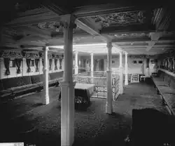 The architect Thomas Collcutt designed Himalaya's public rooms.[14] He designed her music room in neoclassical style, with slim columns with Composite capitals.[15] Her main dining saloon was 60 ft (18 m) long, extended the entire width of the ship, and could seat 206 diners.[16]