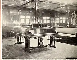 She had berths for 440 first class, 246 second class and 2,200 steerage passengers.[3] Her passenger accommodation included a Dutch smoking room, decorated with views of New Amsterdam; a Japanese-style tea room; and an Empire style social hall.[2] Her holds had capacity for 631,000 cubic feet (17,868 m3) of grain, or 578,000 cubic feet (16,367 m3) of baled cargo.[3]