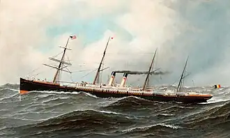 Westernland was built in Birkenhead by Laird Brothers, and was launched on 4 August 1883.[2] She was fitted with Scotch marine boilers[3] powering a single compound steam engine as her primary means of propulsion, notably using the largest piston that had ever been made,[4][5] but also carried sails on her four masts for auxiliary power.[4] Westernland was the first Red Star Liner to be constructed from steel rather than iron, and was also the first in the company's fleet to sport twin funnels.[6]