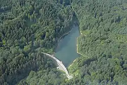 After a few hundred metres, the streem feeds into the Ronsdorf reservoir. Below the reservoir's dam it flows through several pools, constructed to harness water power from the dam for mills which are no longer in operation.