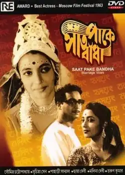 Saat Pake Bandha is a Bengali romantic film starring Soumitra Chatterjee, Suchitra Sen, Pahari Sanyal and Tarun Kumar. Directed by Ajoy Kar, it was a box office success upon its release. The movie was remade in 1963 in Telugu as Vivaha Bandham, in 1974 in Hindi as Kora Kagaz and in Tamil as Lalitha in 1976 and in Malayalam as Archana Teacher (1981).[1]