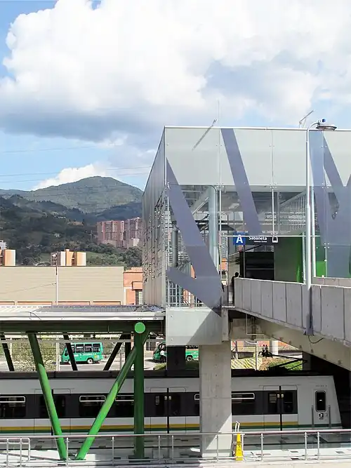 Sabaneta is a station on line A of the Medellín Metro going south.[1] The station was opened on 17 September 2012 as part of the extension of the line from Itagüí to La Estrella.[2] This station is known for having a more modern appearance than the other stations.