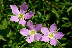 Sabatia campestris is an annual plant growing to 15–25 cm (6–10 in) tall with pairs of opposite leaves 8–40 mm long and 5–20 mm wide. The flowers are produced in open, long-stalked cymes at the top of the stems; the flower corolla is about 40 mm diameter, with five pink (rarely white) lobes with bluntly acute apices, and a contrasting bright yellow central 'eye'; they are hermaphrodite (contain both male and female organs). The fruit is a capsule containing numerous small seeds.[5][6]