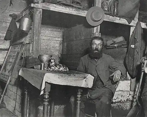Riis in his photographic and journalistic work documented the working life of emigrants of many different origins, like the Italians, the Irish, the Chinese and the Jews. This photograph became one of the most idiosyncratic depictions of Jewish emigrants in New York in the late 19th-century. It was taken at Ludlow Street, on the Lower East Side of Manhattan, and depicts a Jewish man, sturdy and bearded, poorly dressed, with his hat hanging above him on a peg, most likely an emigrant, who is celebrating the Jewish festivity of the Sabbath in a very poor environment, which is the coal cellar where he lives and works as a cobbler. The man does have a table prepared for the celebration, covered with a cloth and with the braided bread known as challah, and other utensils, in an attempt to maintain the tradition with dignity in a very poor place. To the left it's visible a placard written in Yiddish. To the right, a man is barely visible, carrying a shovel, probably a working companion, since he was almost totally cropped from the photograph. The surprised look of the man is most likely due to the effect the flash photographs used by Riis sometimes had on the people he captured on camera, often without their permission.[2][3]