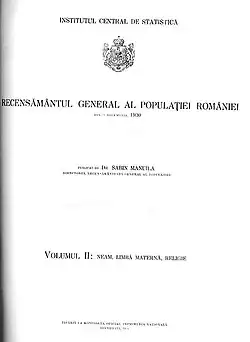 In 1937, Sabin Manuilă was an official host, and Veturia a guest speaker, at the Bucharest Anthropological Congress, placed under the patronage of King Carol II.[51] From 1938,[5] Manuilă headed his own Central Statistical Institute (Institutul Central de Statistică, ICS), while also serving as Secretary General of the Statistical Society, seconding Gusti.[18] This move was a sign of his quarrels with Moldovan, who nevertheless continued to influence the Manuilă's work.[52] His new research produced several detailed monographs, including a 1937 study on Populația României ("The Population of Romania"),[53] and a 1938 Romanian encyclopedia (Enciclopedia României), which detailed and examined the 1930 census data.[54] Dealing with the Great Depression, his articles of the time discuss the "overpopulation" of Romania's universities as a cause of white-collar unemployment, proposing a government selection of the human capital.[55] However, when Carol II ordered him to estimate the number of jobless people with a college diploma, Manuilă counted 6,000 individuals, which was well below official expectations.[56]