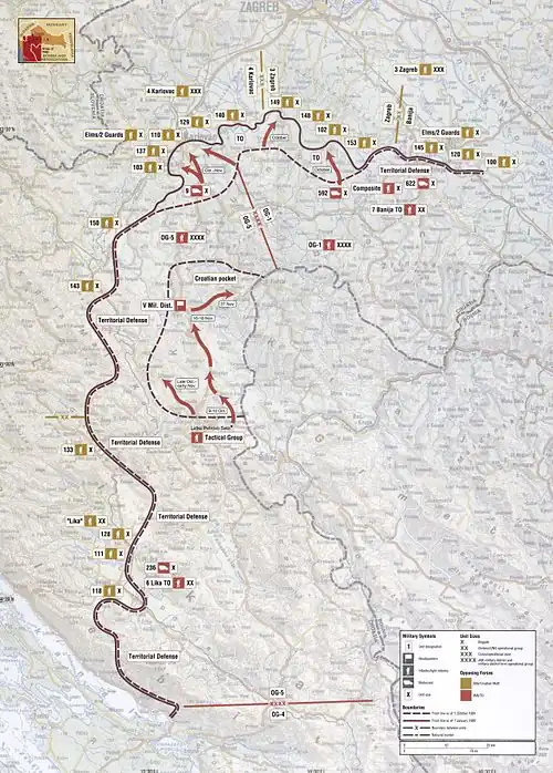 The Saborsko Independent Company, consisting of approximately 30 personnel, was stationed in the village by the Croatian police the day after the Plitvice Lakes incident on 1 April 1991.[17] The tensions worsened in July. That month the JNA distributed 1,000 small arms to ethnic Serbs living in Gorski kotar region, including Plaški. Skirmishes took place near Josipdol and Plaški.[18] In June–August, Saborsko was targeted by artillery and mortars positioned at JNA barracks in Lička Jasenica, and the bulk of its civilian population fled by early August. However, approximately 400 returned to their homes the same month after 20–30 special police troops were deployed from Duga Resa to Saborsko along with 15–20 regular police drawn from Slunj as reinforcements.[19] On 25 September, 100–200 police reservists arrived to Saborsko from Zagreb. The final Croatian reinforcements arrived in October, consisting of 20–50 police.[20] By October, a pocket of Croatian-controlled territory formed around the town of Slunj south of Karlovac, on the boundary of the regions of Kordun and Lika, hampering direct communications between SAO Krajina-held areas in the two regions.[21] The pocket was separated from the bulk of the Croatian Government-controlled territory by the SAO Krajina-controlled town of Plaški to the west. In turn, Plaški was inaccessible to the central SAO Krajina authorities as the road to Plaški ran through the village of Saborsko, situated within the Slunj pocket.[18]