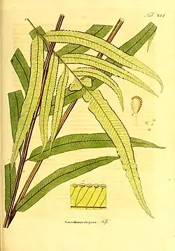 Saccolomataceae is a family of ferns in the order Polypodiales with about 19 species. It has been formerly treated as part of the Dennstaedtiaceae, however it has been classified as its own family according to Smith et al. (2006)[2] The genus Saccoloma has been classified to include Orthiopteris, but the phylogeny of the group not yet fully understood.[3] The family includes a dozen known species.[4]