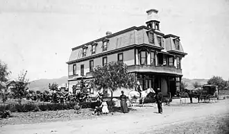 Sackett Hotel, the first hotel in the area that would later be known as Hollywood, was built by Horace David Sackett and Ellen Sackett in 1888,[1] on land bought from Harvey Henderson Wilcox for $2000 ($69,993 in 2024). Located on the corner of Prospect Avenue (Hollywood Boulevard today) and Cahuenga Boulevard, the hotel was three stories tall, featured a mansard roof, and was made of wood.[2]