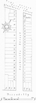 The land on which Sackville Street stands, like Albany and Burlington House, was formerly known as Stone Conduit Close. It was bounded on one side by Penniless Bank and on the other by Swallow Close. It passed into Crown ownership in 1536 and formerly belonged to the Abbot and Convent of Abingdon. The land was then much divided, leases granted and ended, and ownership changed several times.[1] Sackville Street is first mentioned in the Ratebooks in 1679.[2]