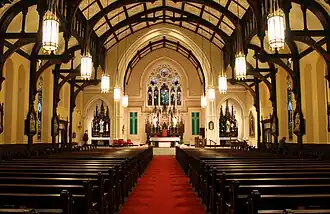The church features an open interior without columns. There is an extensive amount of woodwork in the interior, including the altars, pews, ceiling, wainscoting, and the gallery frontal. There are four sets of oak pews across the width of the church. The vaulted ceiling is supported by hammer beams. The reliefs below the old high altar depict the sacrifice of Able, Abraham and his son Isaac, and the priest Melchizedek. The three Old Testament images are found in the Roman Canon. The statues of St. Peter and St. Paul were added later. Gold reliquaries that contain relics of various saints are in nooks on either side of the reredos. The shrine of the Blessed Virgin Mary on the left side of the church contains statues of St. Benedict on the left and St. Thomas Aquinas on the right, that were added in 1902. At the base of the altar is a relief of the Dormition of the Virgin. The St. Joseph shrine contains statues of St. Ignatius of Loyola on the left and St. Anthony of Padua on the right that were also added in 1902. At the base of the altar is a relief of Joseph on his deathbed with Mary and Jesus at his side. Initially, the bishop's throne was placed in the archway on the left side of the sanctuary. The large Stations of the Cross are bas reliefs with wood frames that line the sidewalls of the church. They were installed in 1892.