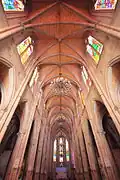 Since its completion in 1888, the cathedral has undergone three major repairs. The first time was in the 1920s and 1930s, when then Bishop Antoine-Pierre-Jean Fourquet, M.E.P. (魏暢茂), replaced the timber roof, beams and steel staircases with concrete ones. A second repair took place after the Cultural Revolution in the 1980s. Recently between 2004 and 2006 the largest repair works were carried out. The church paid ¥3 million and local Catholics donated about ¥2 million for the ¥26 million project, while the rest was covered by the local government. The aim of the restoration was to solve the problem of leakage by rebuilding the whole roof, which was the most challenging task as the rib vault below needed to remain untouched and intact. Most of 19th century stained glass was damaged during wartime and smashed in the Cultural Revolution, so new stained glass was ordered from a Philippine company specialising in church glass.[8] It resulted in the new stained glass carrying English descriptions instead of Latin and French texts of the original French glass. New lighting, audio and CCTV systems were also installed. The original French mechanical clock has long gone, so a new 750,000-yuan clock tailored for the clock tower was ordered from a Chinese clock factory.[8]
