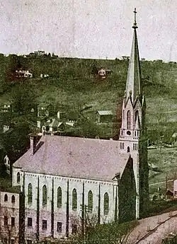 In 1837, four German Catholic families arrived in Pomeroy to work in the coal mines there. Their sacramental needs were administered to by a priest from Marietta, who only spoke English while the miners and their families only spoke German.[1] In 1845, an advertisement encouraging Catholics to come and settle in the area was posted in the Catholic Telegraph of Cincinnati.[2] By 1848 the population had grown such that both a resident priest and a dedicated church building became more of a priority. That same year, 46 people came together to plan the building of a dedicated church.